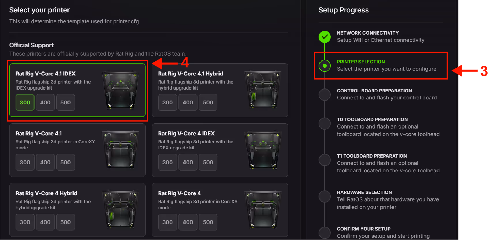 - In the Printer Selection menu (3), choose the IDEX (4) variant that matches your machine's size.